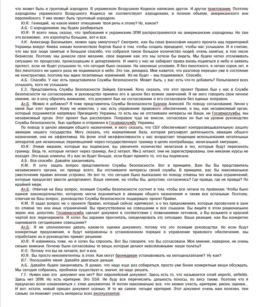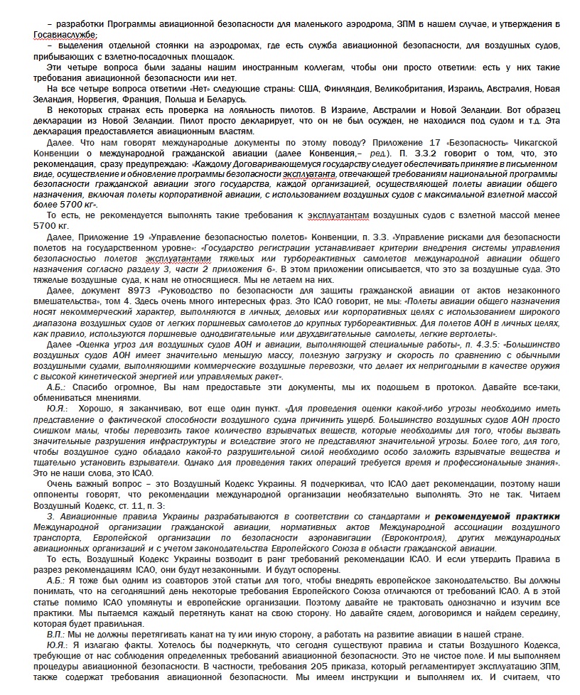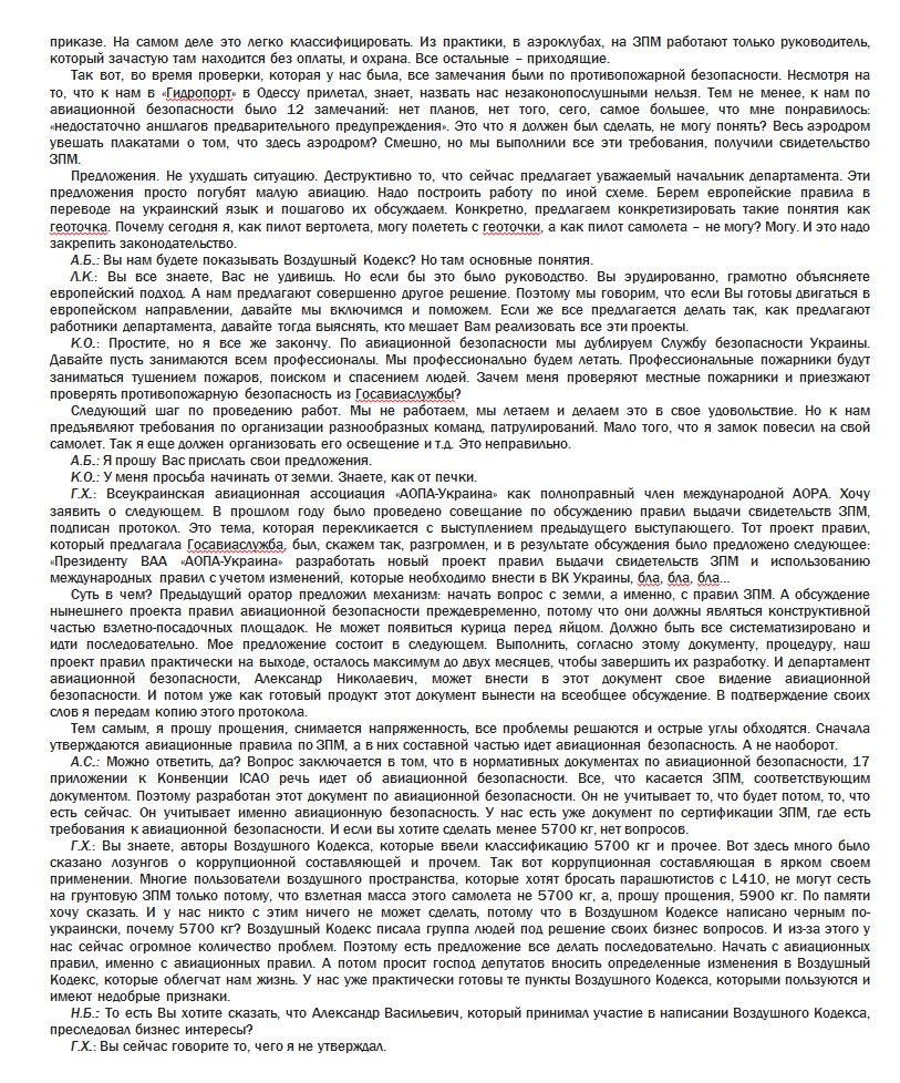 "Г.Х.: Я не хочу ничего. Я наоборот хочу, чтобы было оптимально все. Я не говорю, что это хорошо. Вы сейчас, наверное, меня не правильно понимаете. Я не говорю, что то, что предлагают – хорошо, а вот это – плохо. Давайте мы правильно будем терминологией пользоваться в своих речах и своих высказываниях. В американском документе написано слово «аэропорт», «аэродром». Прошу прощения, аэродром означает, согласно Воздушного Кодекса американского, он означает, что может быть и грунтовый аэродром. В украинском Воздушном Кодексе написано другое. И другое трактование. Поэтому аэродромы украинского Воздушного Кодекса не соответствуют аэродромам, в полном объеме, американского или европейского. У них может быть грунтовый аэродром." :%)