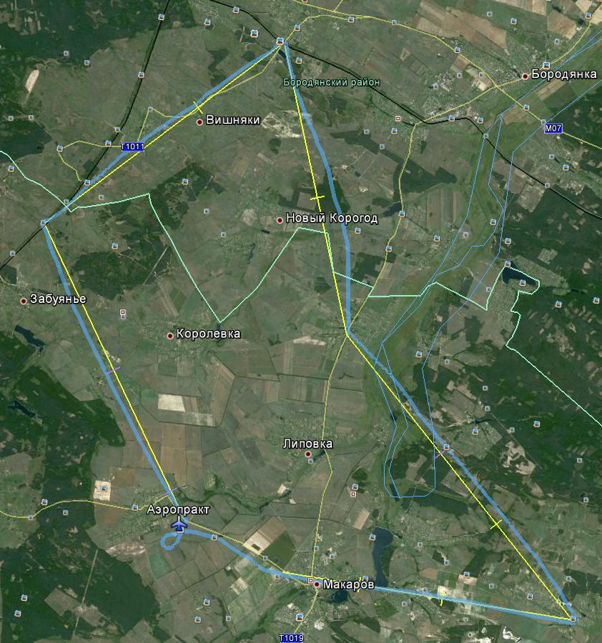 Каждом участнику была предоставлена карта 2-х километровка и логер (маленький GPS без экрана записывающий трек с шагом в 1 сек). Оценка результатов производилась накладывая записанный трек на заранее размеченный маршрут с воротами (в виде поперечных линий длиной 600 м) в Google Earth. Скрытые ворота обозначены тем же цветом, что и линии маршрута, а скрытые временные ворота фиолетовым. Ворота располагались мною таким образом, что бы на карте были объекты для привязки на местности, при этом местность проверялась в Google Earth. То есть, ворота не размещались там где на карте были "белые пятна".