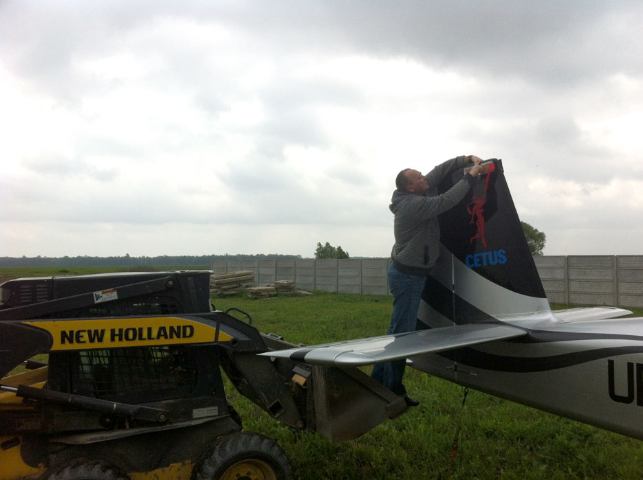 Ввиду отсутствия лестницы, гостеприимными хозяевами нам был выделен модный погрузчик, для фиксации киля