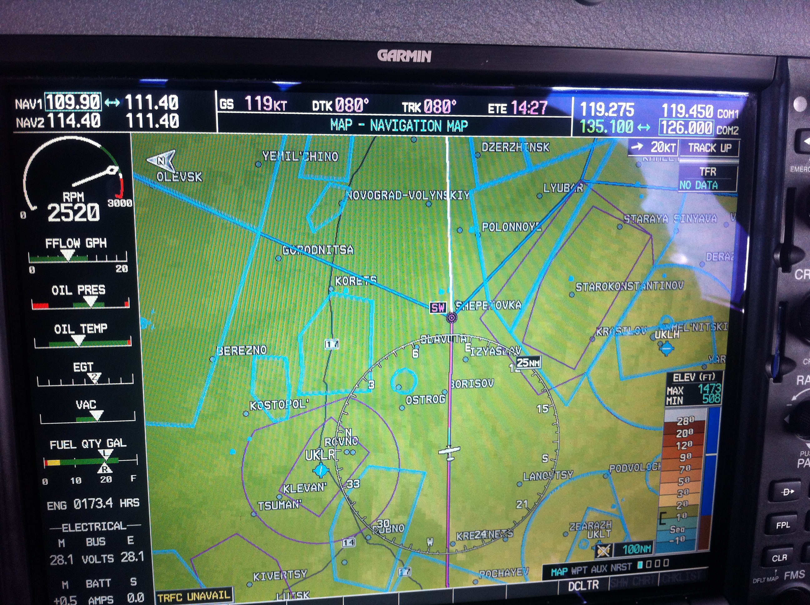 На следующий день утром вылетели в Жешув для того чтоб пройти границу. Границу можно заказать и в Швидник, но они могут не вовремя приехать и стоимость их приезда соизмерима с лишним бензином, который потратишь на лишние километры, которые пролетишь в Жешув. Естественно я выбрал полететь через Жешув, вместо вызова границы в Швидник. Из Швидника вылетели с задержкой (поляки как всегда расслаблены и никуда не спешат :D ) В Жешуве оформились очень быстро, заправились. Был достаточно сильный мороз. Когда спросили приватный или самолет фирмы - ответил приватный. "Тогда вам насчитаем налог"... А у меня есть и фирма, пишите счет на фирму :D В итоге бензин посчитали не по 3,5 как в Варшаве, а по 1,3 доллара, как для "фирмы" :pardon: Когда рулили, диспетчер переспросил подтверждения, что мы будем набирать FL100. Я подтвердил, чем видимо их удивил. Взлетели и сразу пошли на DIBED, без процедуры выхода с аэродрома по правилам VFR. Набрали высоту. Не доходя до DIBED, нам спрямили маршрут и сказали можно идти на DIDUR. (Это был привет от моего сотрудника, который пообещал договориться на спрямление маршрута где только можно. Спасибо Виталик :good: ) После выхода на связь со Львов радар нам разрешили идти прямо на Шепетовку. Пройдя Шепетовку пошел прямо на KI, но путь был скорректирован диспетчером на Черняхов, ввиду стрельб возле Житомира. Обойдя зону возле Житомира, опять разрешили идти прямо на Жуляны. Уже с траверза Житомира летел курсом 081 (так как и расположена полоса в Жулянах) и начал снижаться уже на траверзе Наливайковки с 10000 до 4000 футов, а затем и до 2200. Потом диспетчер подхода спросил какой полет мы выполняем визуальный или инструментальный. Вначале запретил посадку, ввиду захода солнца, но потом после цитирования определения захода солнца из JAR FCL 3 разрешение на посадку было получено. Меня радовало то, что это последний спор о заходе солнца, ввиду того, что ночной рейтинг был пройден и в следующий раз проблем с посадкой после захода солнца не должно возникать... :good: :roll: после Шепетовки очень спешили ввиду захода солнца и потому шли на максимальной скорости. Если бы маршрут не был спрямлен, могли бы опоздать... :o