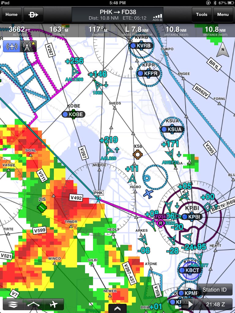 ну и в догонку - светлое настоящее, скрин с ADS-B трафиком и погодой (бесплатное и то и другое с наземных станций). Маршрут и мое нахождение вне его можно игнорировать - взлетел из FD38 и еще не вколотил в айпэд куда мне надо :)