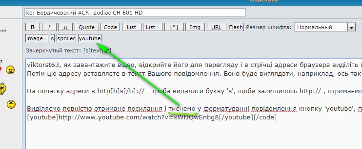 Виділяємо повністю отримане посилання і тиснемо у форматуванні повідомлення кнопку 'youtube', після чого посилання у тексті повідомлення виглядатиме ось так: