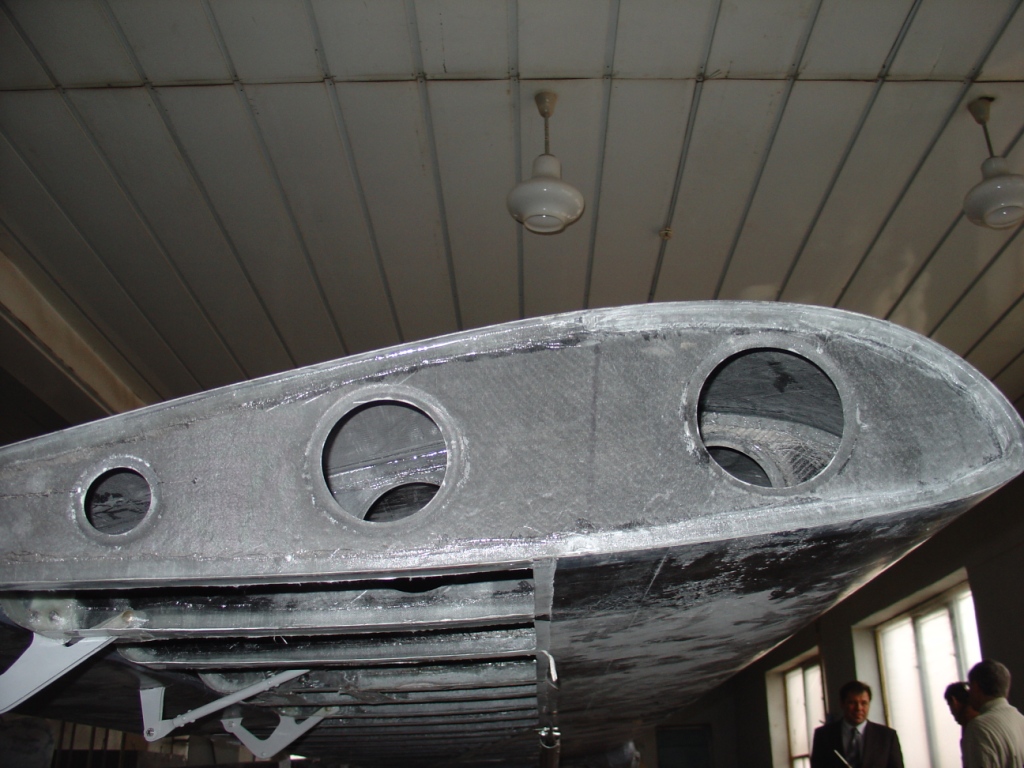 А вот на АИ-шке, крайней летающей, лонжерон стабильника, о котором тут была случайно речь :oops: карбонизирован. Правда немного не традиционным способом. В районе вклейки лонжерона в работающие корки обшивки было уложено однонаправленное углеволокно. В верхнюю корку и в нижнюю естессно. :pardon: Одно полотно (300 мм ширина) нарезалось по размаху, края обрезались под углом 20 град. получалась трапеция. И от основания сворачивалось 6 раз. Затем второе полотно меньшее по размаху на 500 мм. обрабатывали так же. И третье ещё на 500 короче. Итого на верхней полке лонжерона получали полосу переменного сечения, шириной 50 мм., состоящую из 18 слоёв однонаправленного углеволокна. Так же и нижнюю полку лонжерона, формованную в нижнюю обшивку. Т.е. мы получали стеклопластиковый лонжерон с верхней и нижней полками из угля. Выиграша в весе не было никакого :shock: