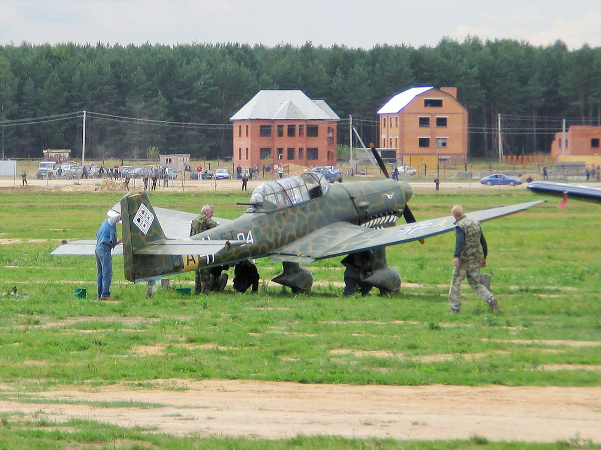 Владимир Иванович Нессонов (в камуфляже у хвоста) с товарищами собирают свой самолет в Монино на "Летающих легендах - 2004", 13 августа 2004 г.
