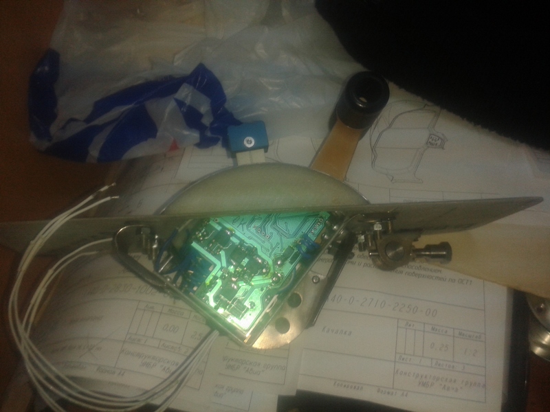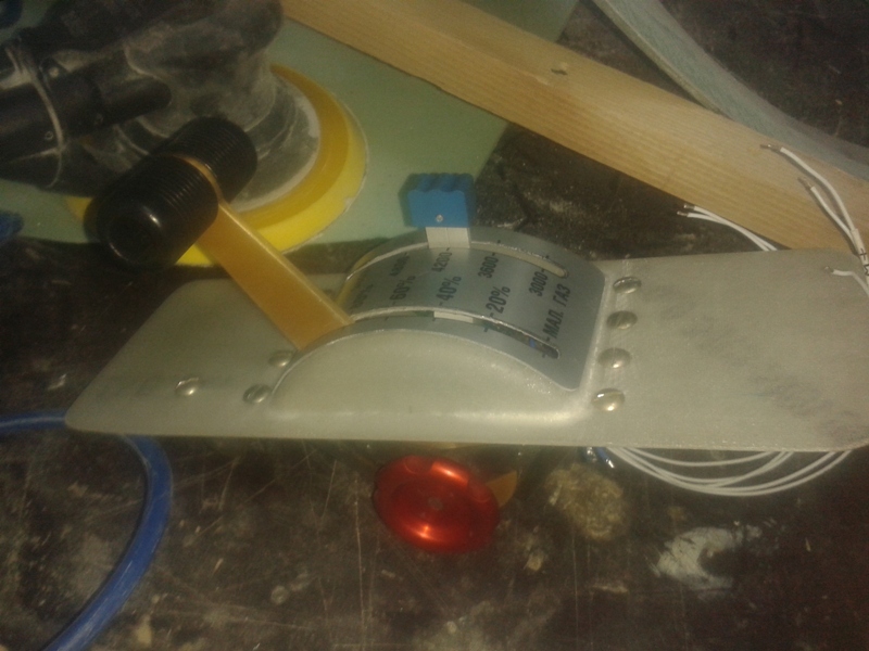 Собрал блок РУД и Управление шагом винта. Плата управляет автоматически шагом ВИШ через две счетки, установленных на крышке кока винта. В ступице винта установлен электродвигатель. ВИШ сделан Киевской фирмой и расчитан на 200 л.с. РУД управляет двигателем через тросик тяни-толкай.