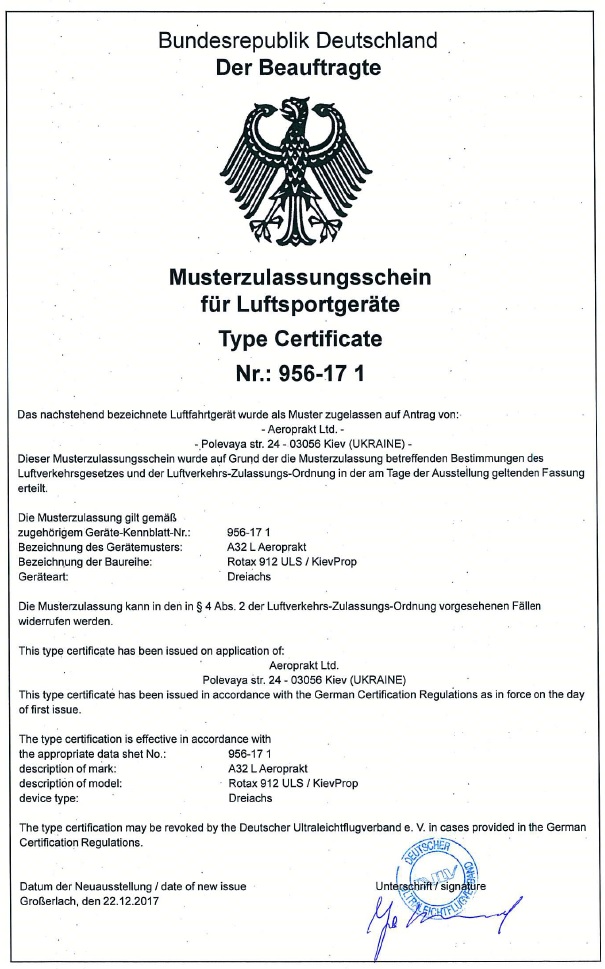 Сегодня у нас БОЛЬШОЕ событие - после года интенсивной работы, получен немецкий сертификат типа на ультралайт А-32L.