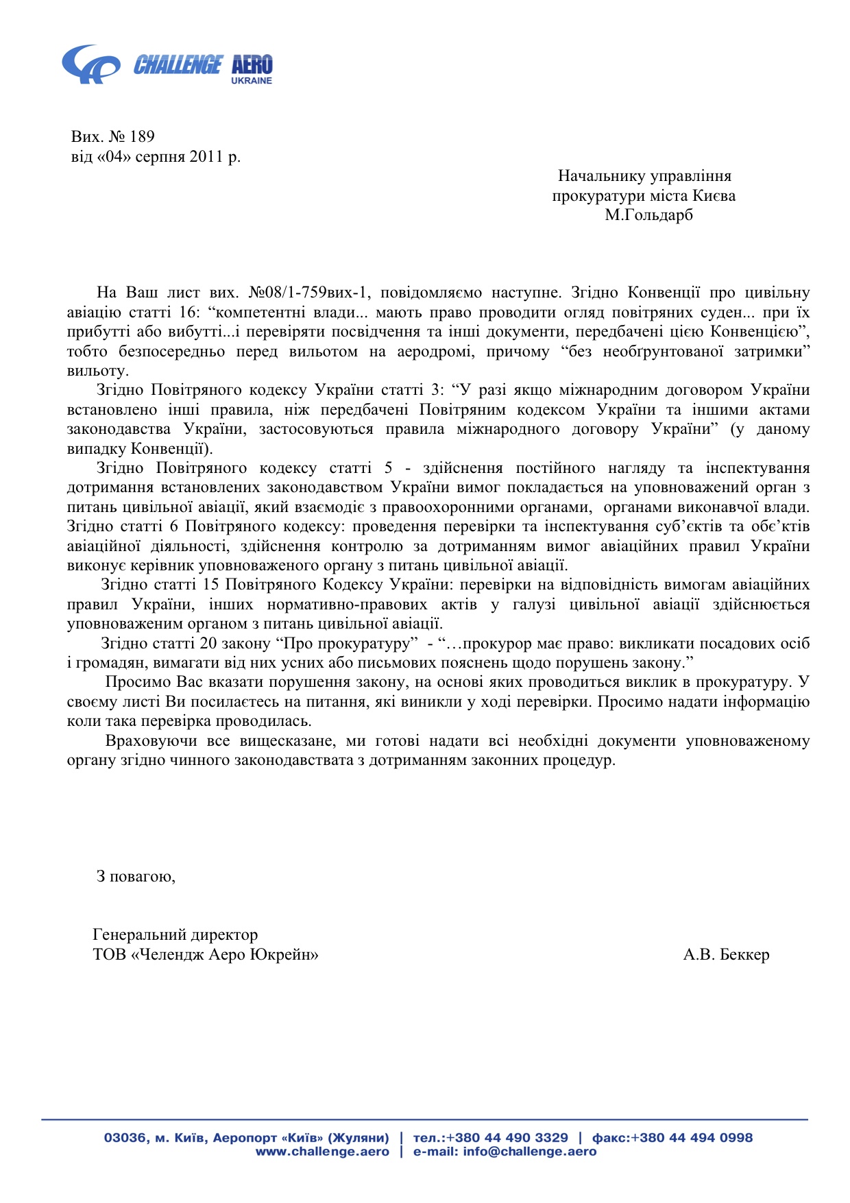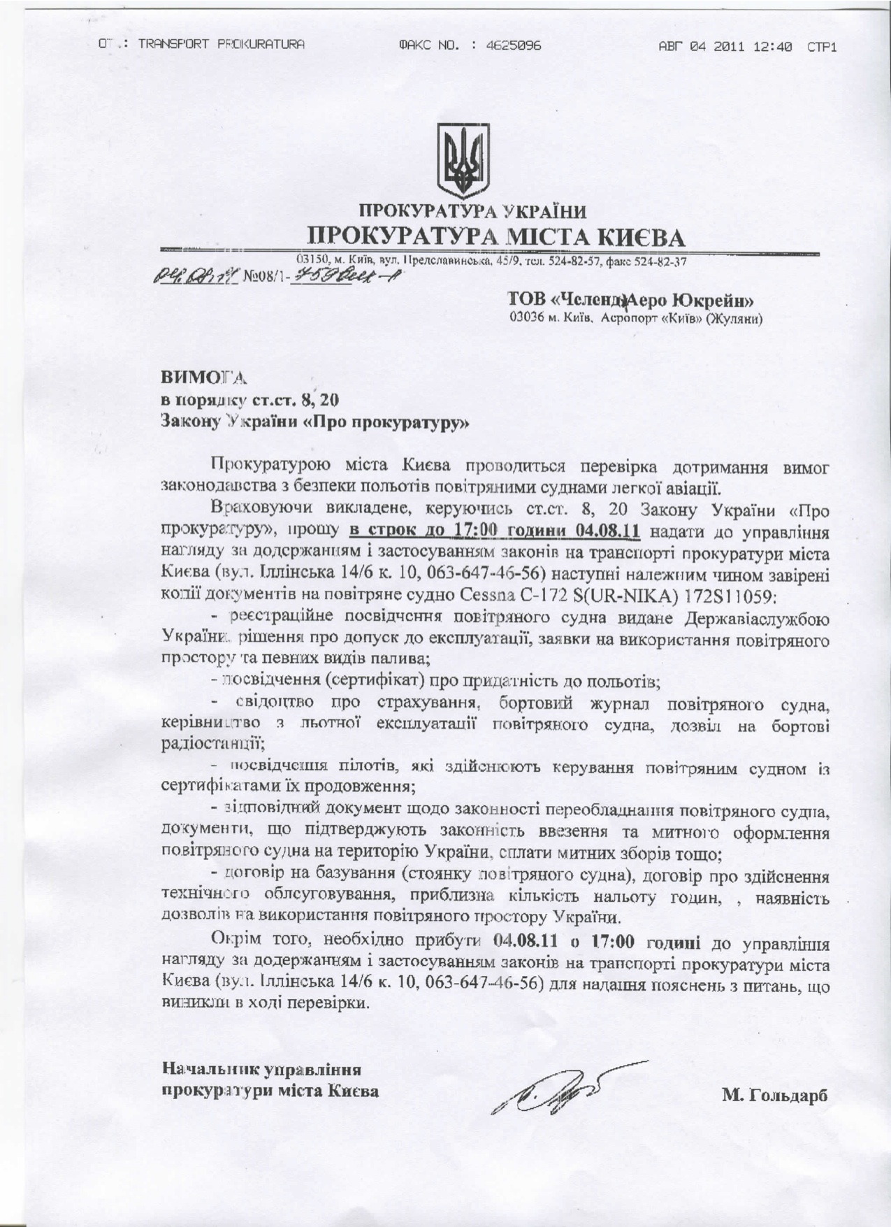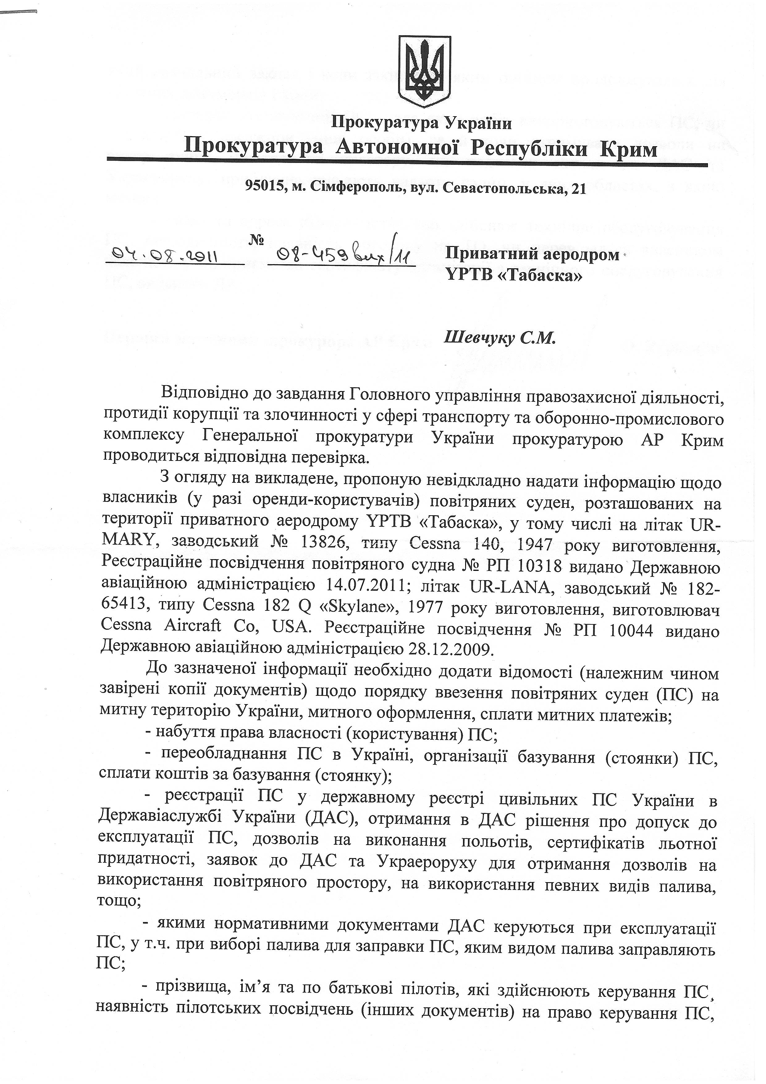 Итак, от проверки самолетов авиакомпании после устной беседы прокурорские отказались. Но сегодня получил письмо по UR-NIKA следующего содержания