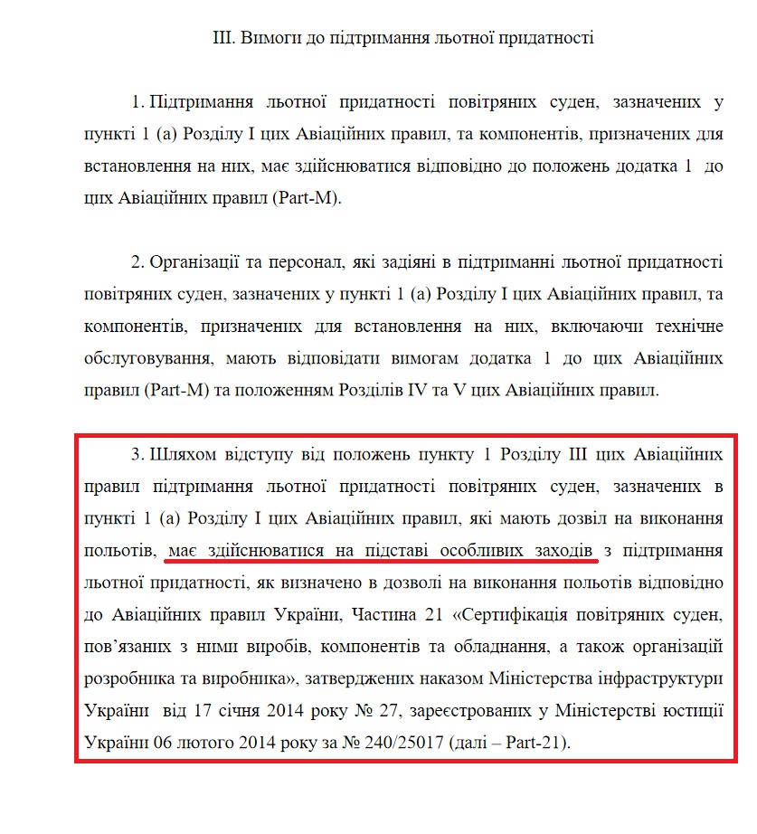 "Підтримання льотної придатності повітряних суден та авіаційних виробів, компонентів і обладнання та схвалення організацій і персоналу, залучених до виконання цих завдань". В пункте 3 раздела ІІІ этих Правил