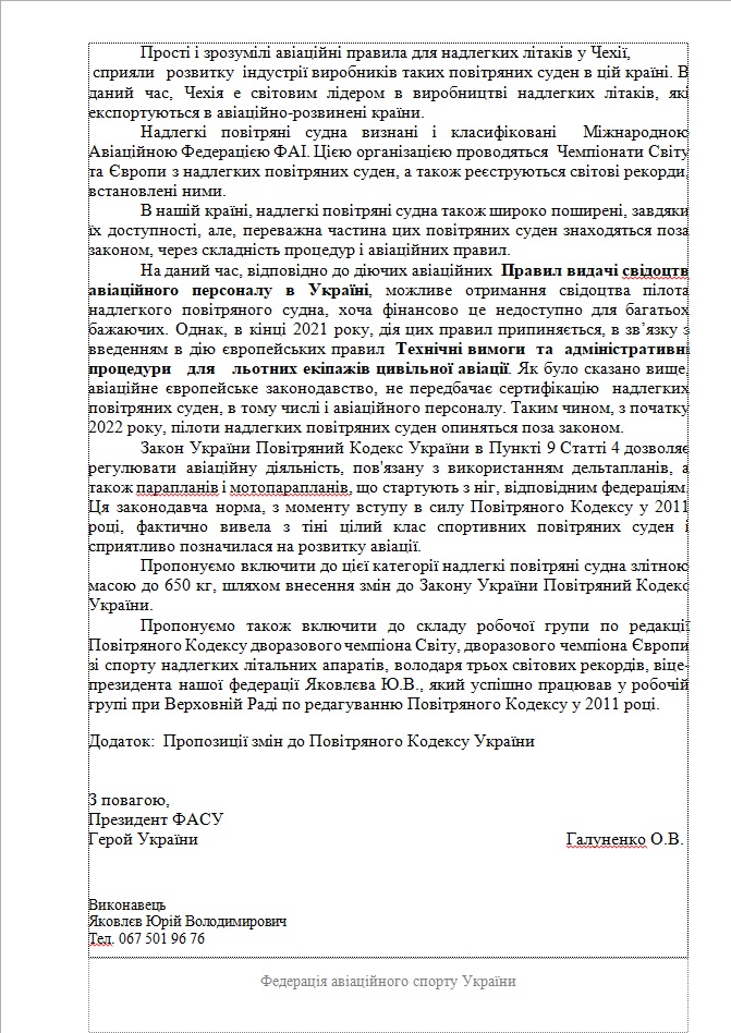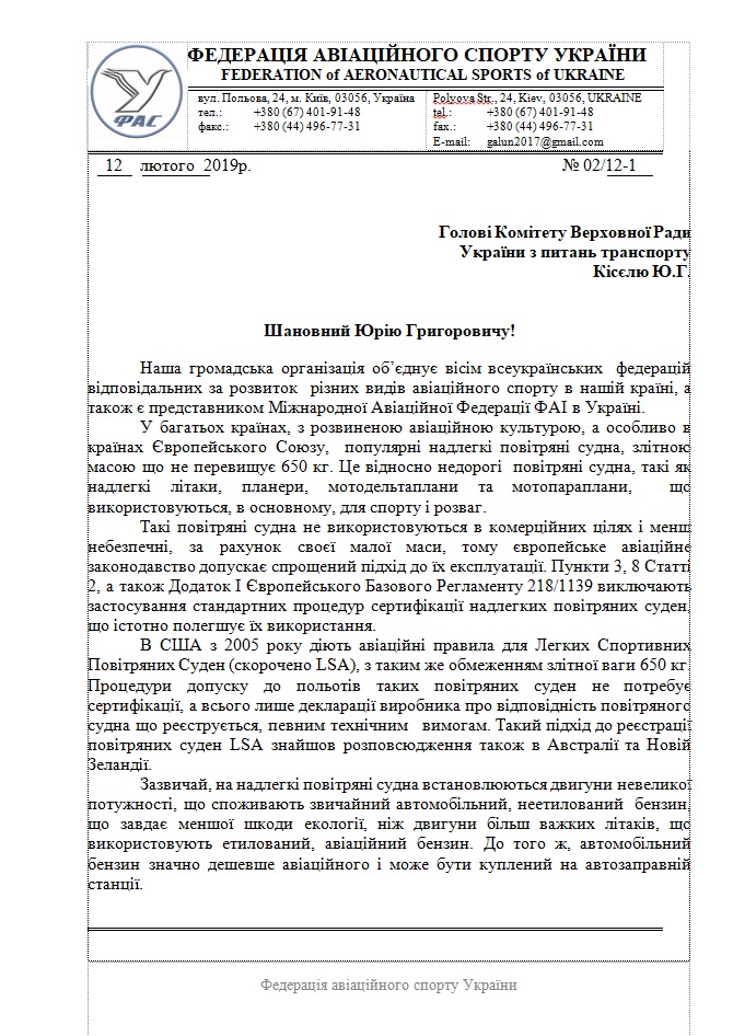 Обсудив эту проблему в Федерации Авиационного Спорта Украины, где я являюсь вице-президентом, нами было направлено письмо (его скан ниже) в транспортный комитет Верховной Рады, с предложением передать регулирование СЛА соответствующим федерациям.