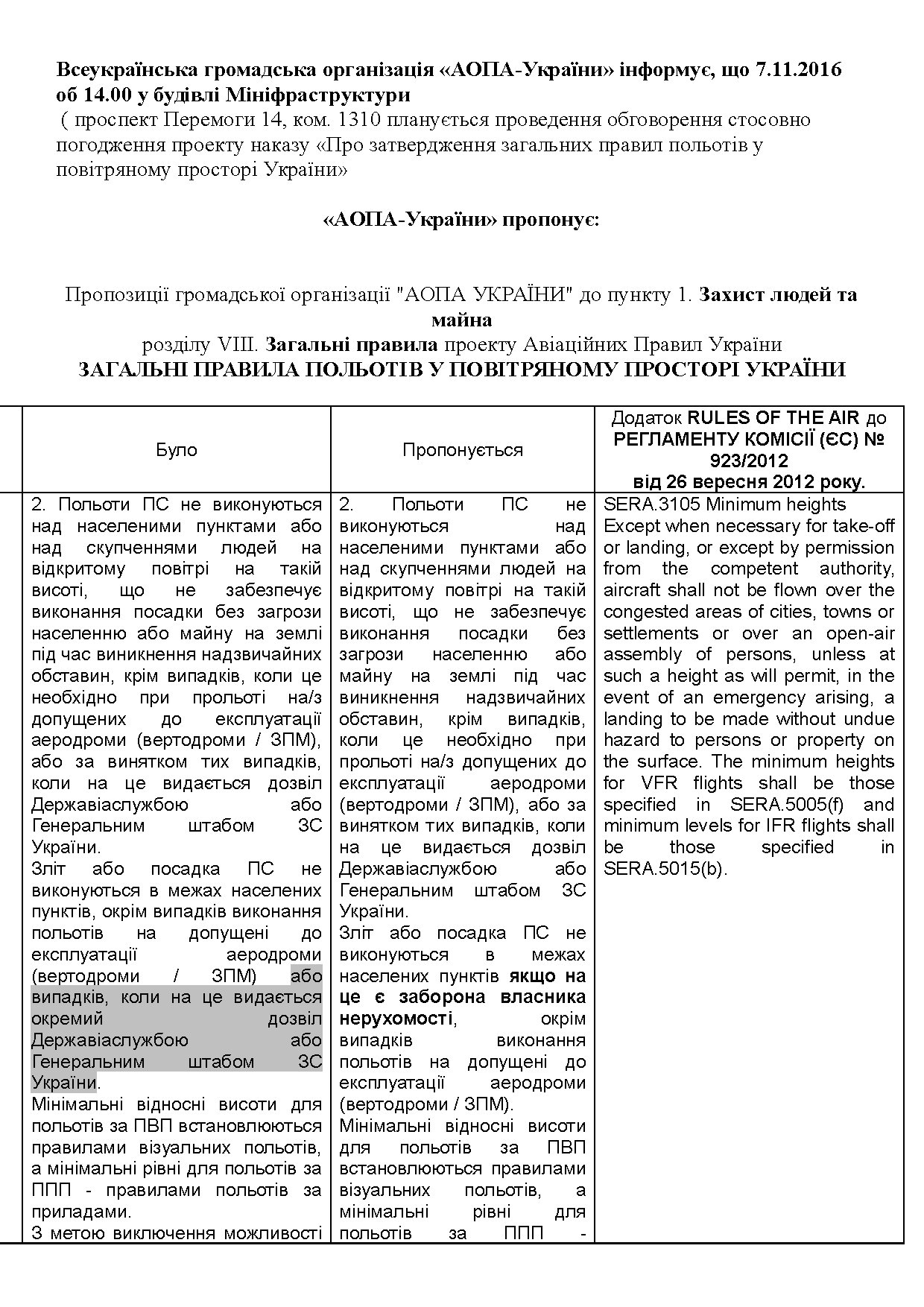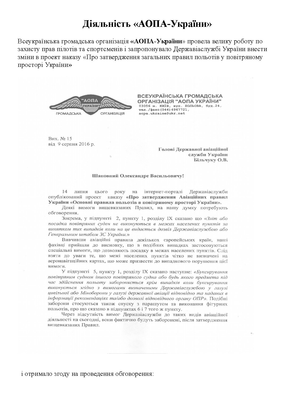 Всеукраїнська громадська організація «АОПА-України» провела велику роботу по захисту прав пілотів та спортсменів і запропонувало Державіаслужбі України внести зміни в проект наказу «Про затвердження загальних правил польотів у повітряному просторі України»