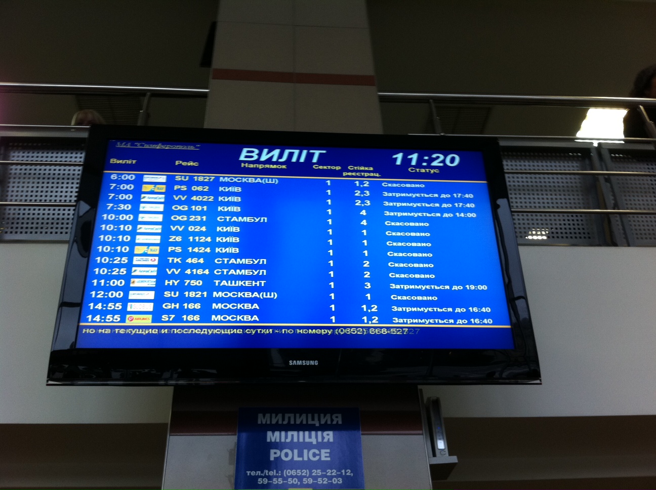 Каток на полосе (сцепление 0.16) , штормовой боковик, и бесперспективность борьбы с ними... На фото промежуточный результат. На он-лайн табло аэропорта - заключительный на сегодня. Единственные оставшиеся оптимисты - AirOnix на 20.00. :)