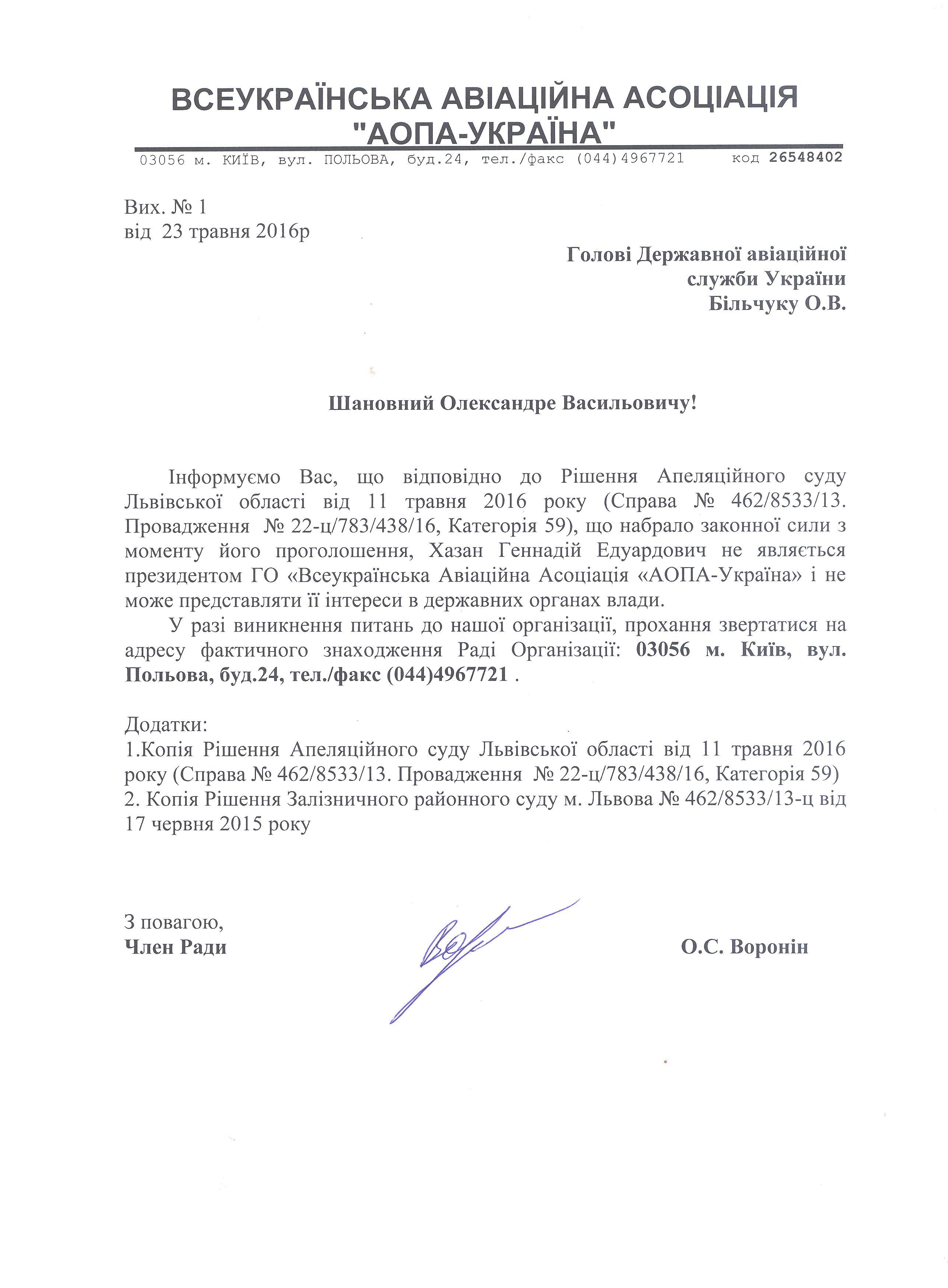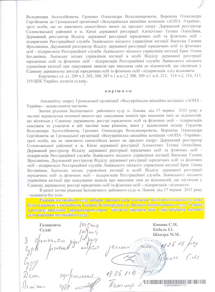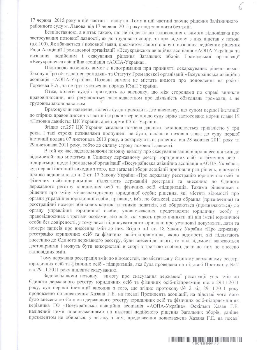 11.05.16 львовский апелляционный суд оставил без изменений решения суда первой инстанции в части признания решений Рады "АОПА-Украина" и Общих Сборов в 2011 году недействительными, а так же противоречащими Уставу организации и законам Украины. Признано, что Гордеев был уволен незаконно, а Хазан был и остается не более чем рядовым членом этой организации. Решение вступило в силу.