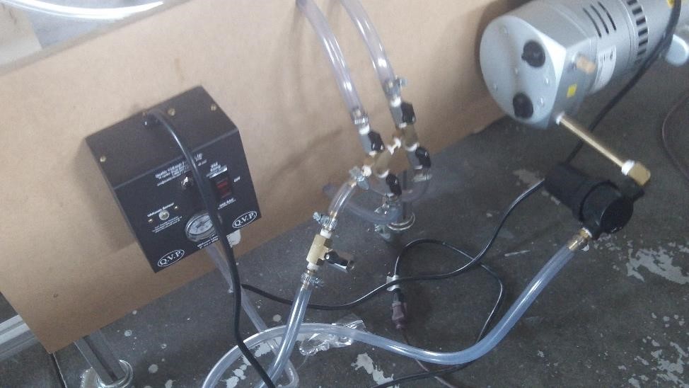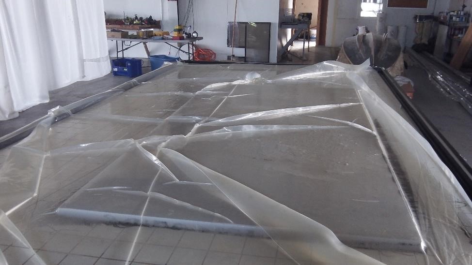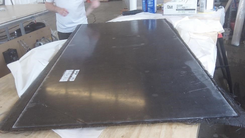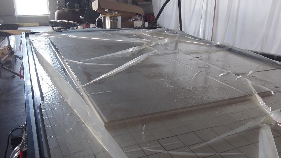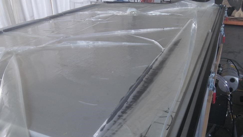 Итак вот что же у нас там сушилось более 15 часов: Стол + насечка для вакуума, Полиэтилен, Оргстекло + Карбон 3 К + Дивинисел + Карбон 3К + оргстекло + полиэтилен, Ну и мешок сверху То есть сандвич из однослоя с двух сторон на Даяб Дивиниселл между двумя листами оргстекла