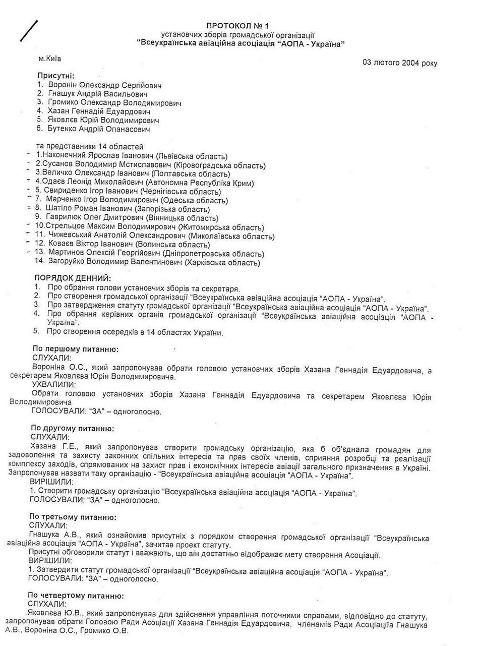 Согласно устава, высшим руководящим органом является собрание членов организации, которое должно собираться не реже одного раза в год. Собрание членов АОПА-Украина не проводилось с 2007 года! Это противоречит Уставу организации. Также в уставе можно прочитать, кто является руководящим органом кроме Собрания членов Ассоциации, а именно: Ревизионная комиссия (не существует), Президент (не избирался), Совет Ассоциации (Хазан, Гнашук, Воронин, Громыко) Ниже привожу несколько протоколов, подтверждающих состав совета, а также должность Хазана. Как видно из документов, Хазан является Председателем Совета Ассоциации, а не президентом, которого не выбирали. Хочу отметить, что согласно устава выбирать президента может только Собрание членов Ассоциации, а не Совет Ассоциации. Следовательно Хазан является САМОПРОВОЗГЛАШЕННЫМ Президентом.