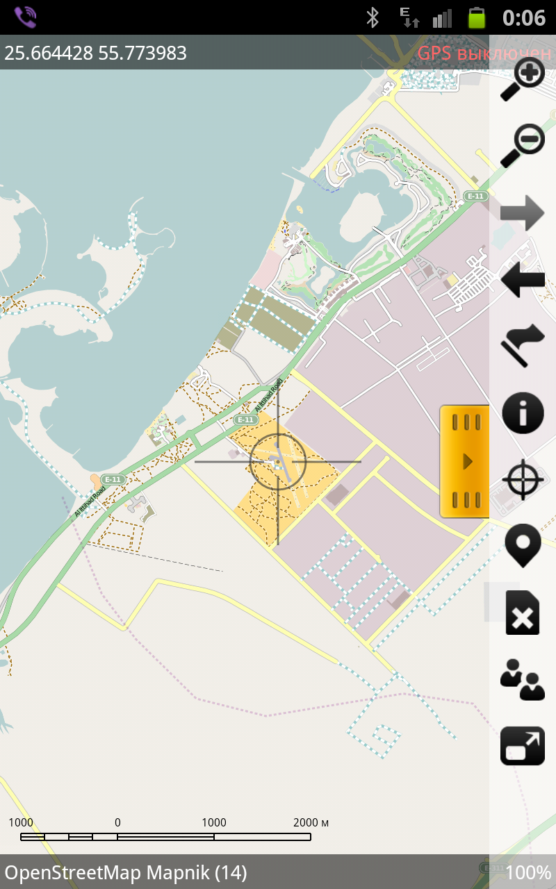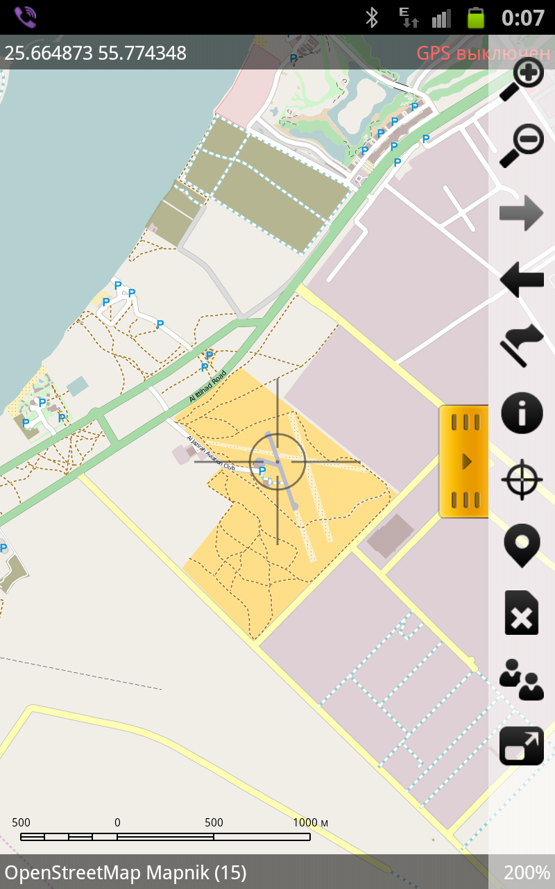 Также полезная функция - направление и расстояние до точки. При выключенном слежении можно переместить "прицел" в любую точку на карте и увидеть расстояние до этой точки над "прицелом" и пеленг своего местоположения - числовое значение и графически.