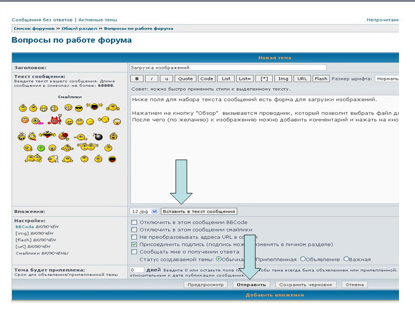 Если загружается только одно изображение, требуется обязательное нажатие кнопки "вставить в текст сообщения", в противном случае сообщение воспринимается как "пустое" и отображается соответствующее сообщение. Еще один вариант - поставить троеточие или прокомментировать несколько слов.