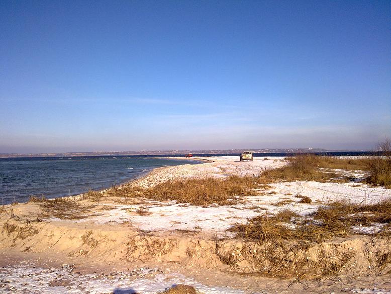 Далее по буеракам, снегам и всяким глубоким колеям наши «стопы» были направлены в сторону Кимбургской косы. На авиационных картах это запретная зона UK-P22 2000/GND. По ней и летом только на тракторе, а зимой по снегам и грязям вовсе движения нет. Но мы же не ищем легких путей… Вот так с шутками, прибаутками (все автомобили оборудованы радиостанциями) оставили Херсонскую область и очутились в Николаевской на самом шпиле, который находится в море прямо напротив Очакова. Дальше только море.