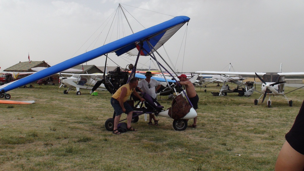 Погодка портится, начинаются порывы ветра, несколько мотодельт стоит не привязанные. А мужики рассуждают: крепить или не крепить мотодельты, а может снять лучше крылья? И здесь начинается самое интересное: ветер дует резкими порывами, каждый раз с разных сторон, мы все вместе держим крылья и поворачиваем их боком к ветру. Парни начинают снимать крылья с тележек и класть их на землю. Порывы усиливаются, я вижу что наш самолет начинает угрожающе раскачиваться и бегу к нему, чтобы успокоить. В это время нвши девушки держат нашу, пытающуюся взлететь, палатку. Сзади слышен какой то непонятный шум. Обернувшись увидел останки армейской палатки, которую сорвало ветром и перекатило (вместе со стальным каркасом!) через всю стоянку англичан. Порвались веревки-разтяжки палатки с палец толщиной!