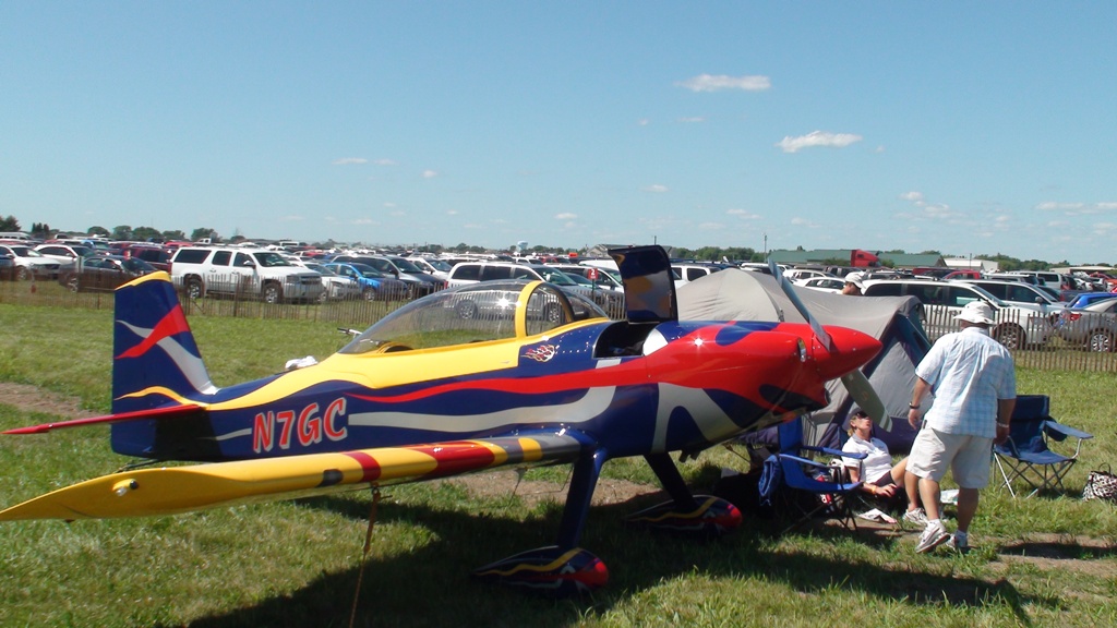 В Ошкош прилетели без проблем. Я, собственно, летел "хвостом" за Дагласом. Радиообмен в районе аэропорта бешеный - отвечать на команды диспетчеров, если он не задаст вопрос, запрещено. Необходимо лишь выполнять их команды. Интересная особенность - по местному НОТАМУ во время проведения выставки ЗАПРЕЩЕНО включать транспондеры из за большого количества ЛА в воздухе. После посадки зарулили куда было можно, а оттуда тащили наши самолеты до нашей экспозиции метров 600-от. Это была самая трудная часть перелета.
