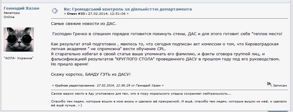 История началась задолго до событий дней минувших, всем известный персонаж Генык «нацюцюрник» всеми мыслимыми и немыслимыми поступками, продолжал гадить где только мог: на Украинских пилотов, на тех людей, которые по настоящему делают то, чтобы поменять как законодательство, так и общественное мнение, к тем людям, которые летают, конструируют, живут этой авиационной жизнью . Я не буду далеко заходить в историю фактов такого вранья и созданных интриг, но его действия связанные с клеветой на организаторов Житомирского слета, и отговоров Российских экипажей не прилетать на наш авиационный праздник, а также экипажей с Европы , меня, как пилота, просто возмущало. Читая его посты на «Укравиа» где все усыпано лживой заботой о пилотах Украины, о его активной работе на благо малой авиации, о его героических поступках на посту Секретаря общественной организации при ДАС, ( откуда его успешно выгнали единогласным голосованием), гнилую историю с избранием президентом АОПА, насквозь построенную на лжи и подлогах. А продажа «дозволIв» иностранным экипажам, для прилета в Украину, по фактам такого характера ведется расследование, продажа страховок по завышенным ценам. Замешан в коррупции по Львовскому аэропорту, а сколько людей кинул с техническим обслуживанием и таких гадостей набирается не на один «підсрачник», а на целую серию. Но верх цинизма - это создание трудностей для группы пилотов желающих посетить байкерский слет в Ужгороде, с дальнейшим полетом в Словакию . Не буду вдаваться в подробности его действий , но желание, а может и панический страх , встретиться с людьми отвечающими за свои слова , в его виртуальный мир не входило. Что и привело к написанию нотамов типа: «без указания Геныка никого не пущать» . По этому факту тоже будет разбирательство , но каково было мое удивление, когда по прилету в Словакию, сторона встречающая сказала, что он и туда звонил, и просил, чтобы нас не принимали, ну каков "Нацюцюрник"! Поэтому, когда я увидел в аэропорту этого героя, экипированного, как боевого пилота, улетающего как минимум за линию фронта, в окружении журналистов, я подошел и сказал: «ведь ты не прав Генык», а он взял и побежал . А зря, ведь какой мог получиться душевный разговор, ну да ладно, встретимся еще, Украина не такая большая, как Сибирь .