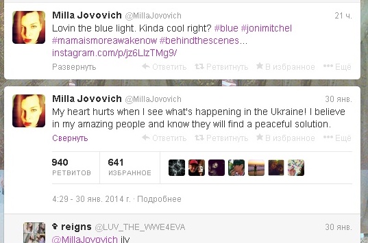 В оригинале твиттера Миллы было на авиационном английском: @MillaJovovich: My heart hurts when I see what's happening in the Ukraine! I believe in my amazing people and know they will find a peaceful solution.