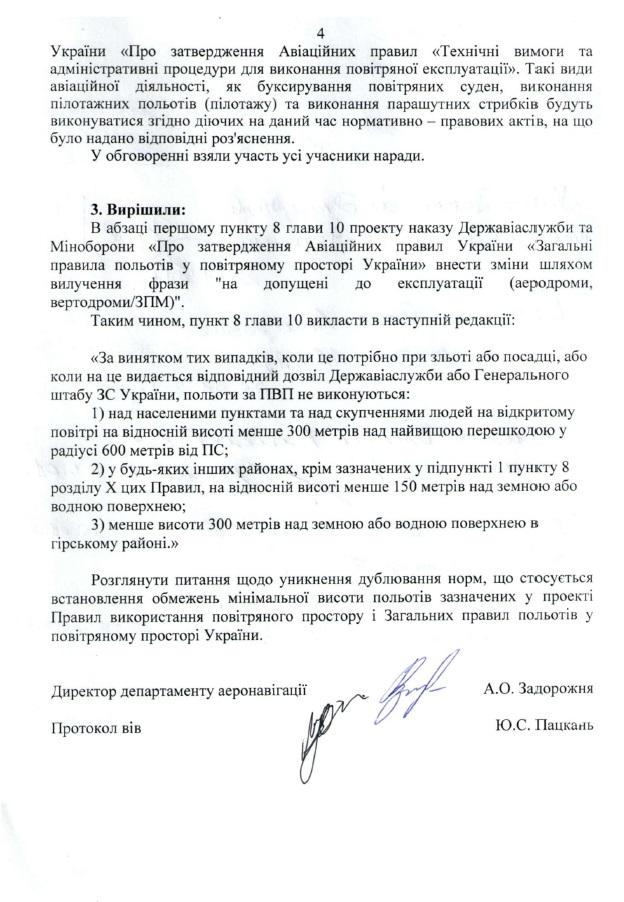 Наша Организация "АОПА Украины" получила официальный протокол решения Круглого Стола, подписанный Головой Державиаслужбы. Решено то, что мы предлагали сделать с самого начала. А именно Пропонується виключити слова «на допущені до експлуатації аеродроми (вертодроми/ЗПМ)» з тексту пункту 8 розділу Х проекту Правил для вирішення цього питання.