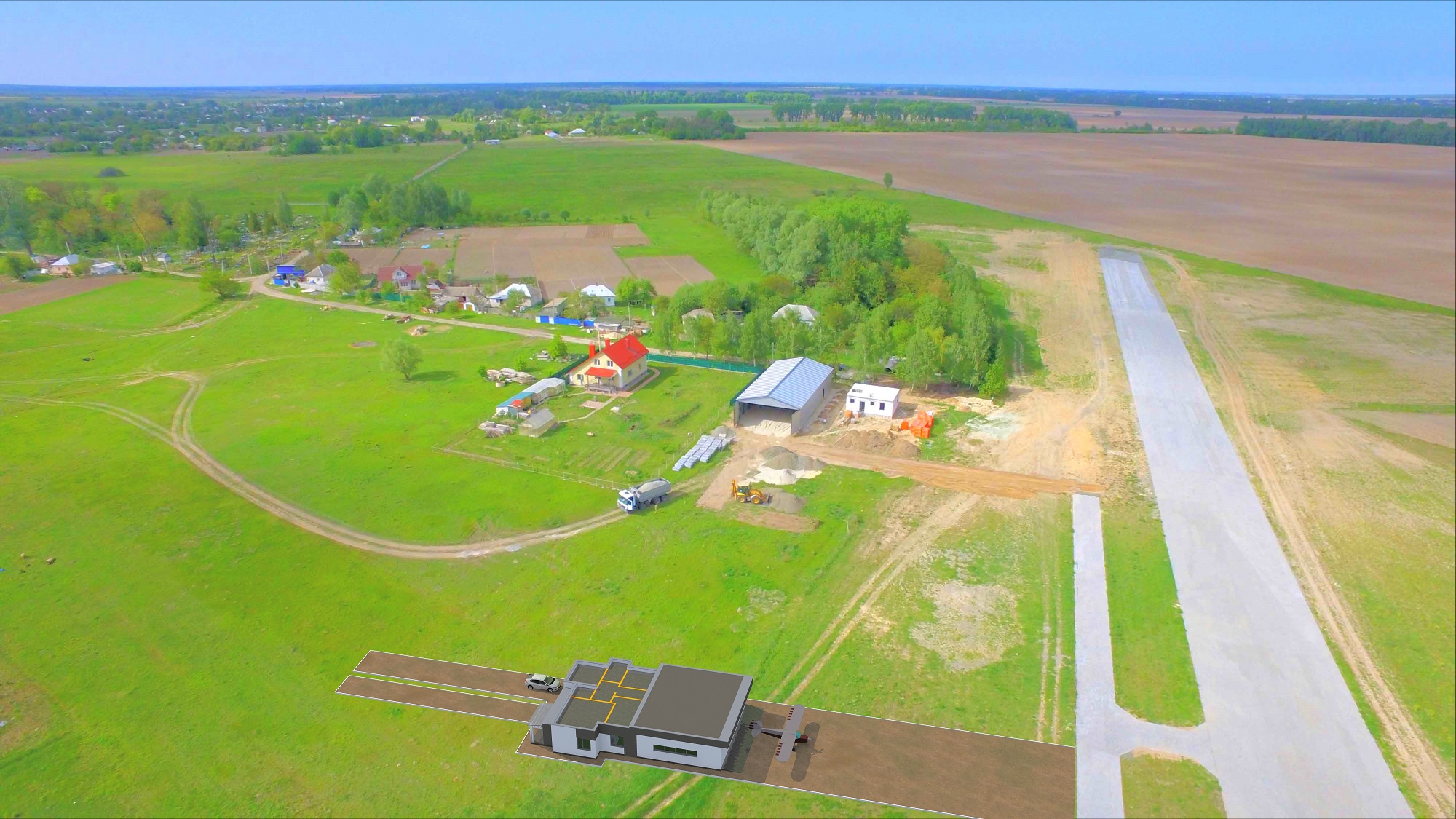 Начал строится первый домик с ангаром для самолетов 18*24м с выездом на ВПП из тротуарной плитки в аэродромной деревне с Гоголев