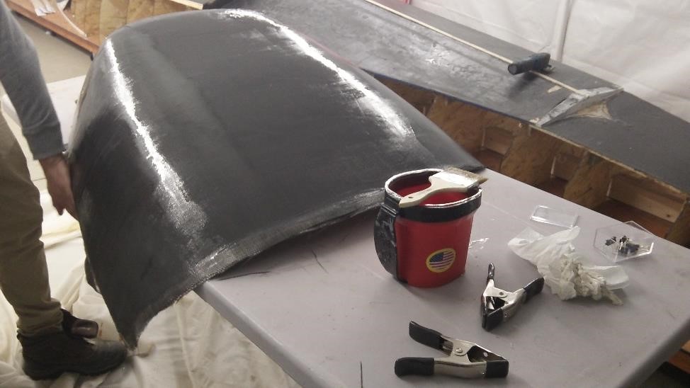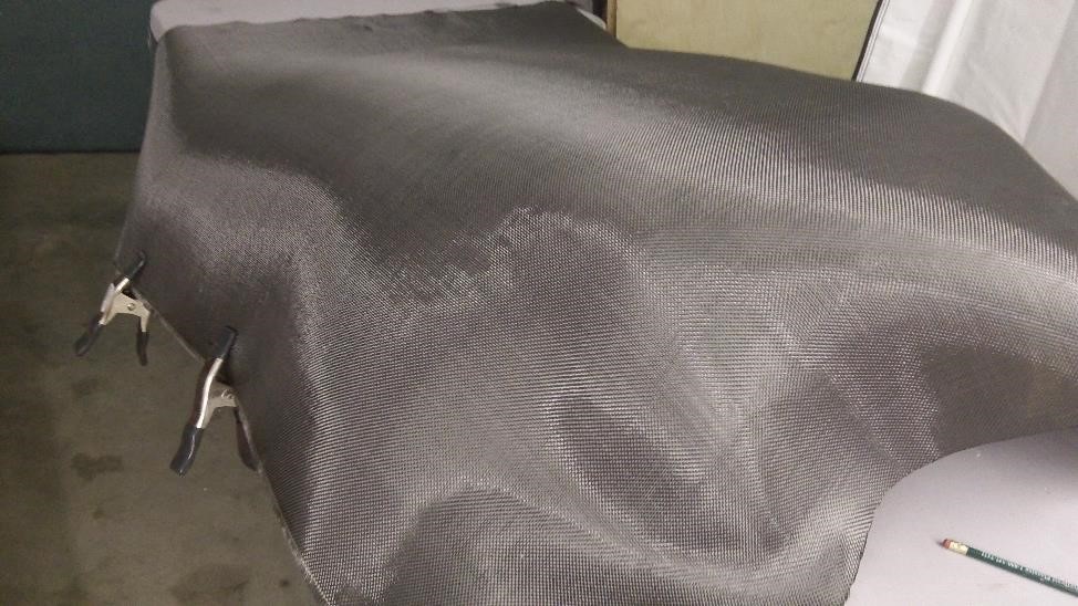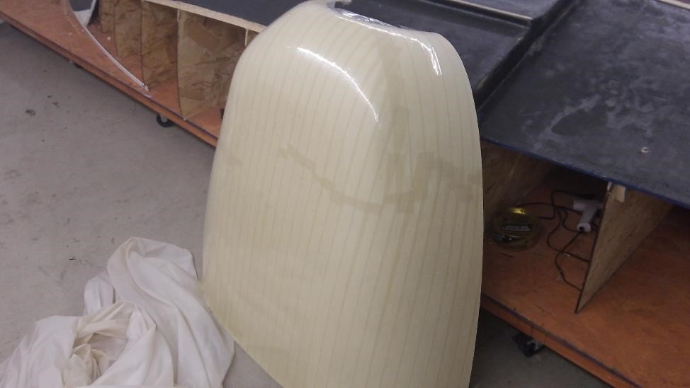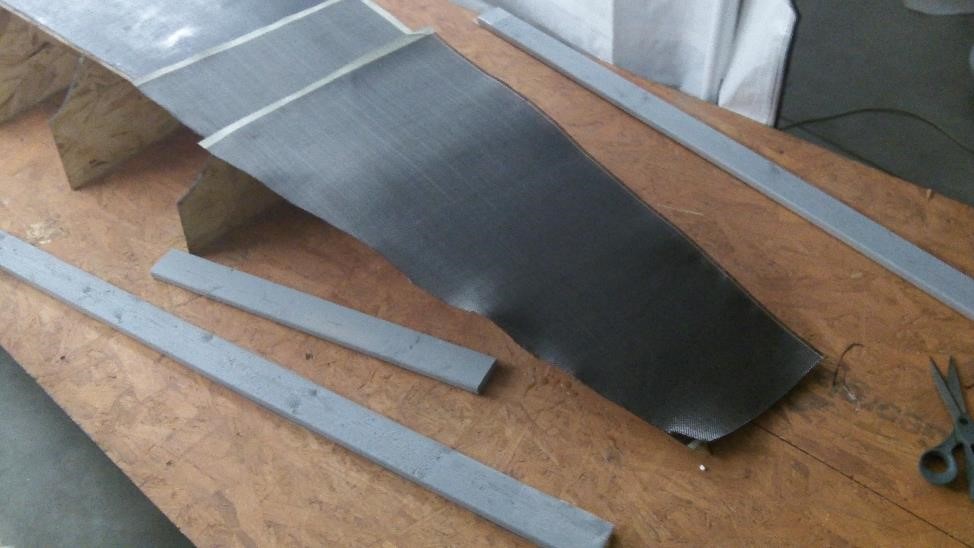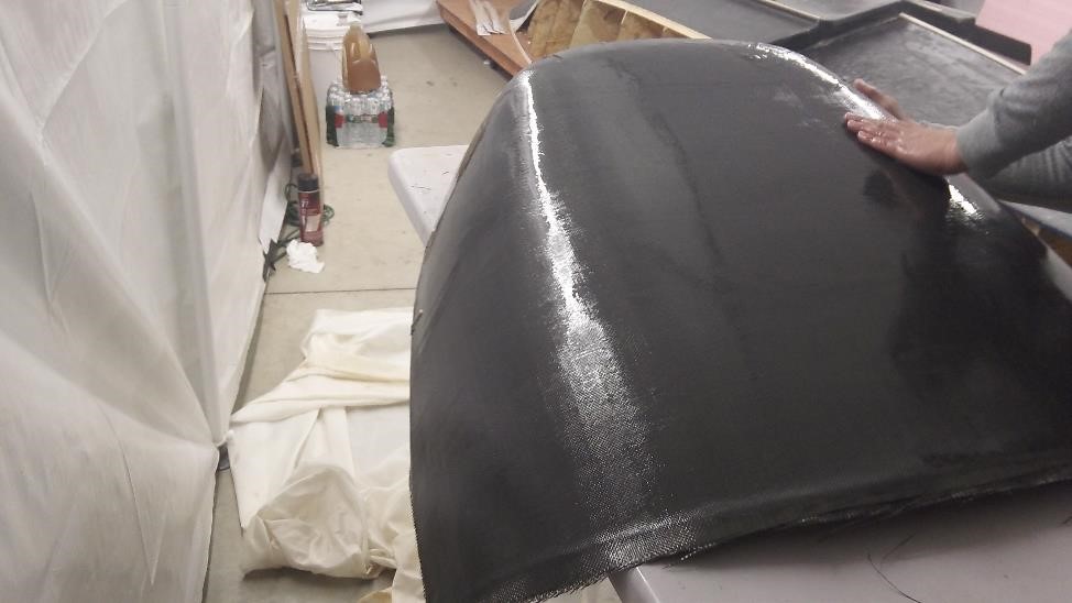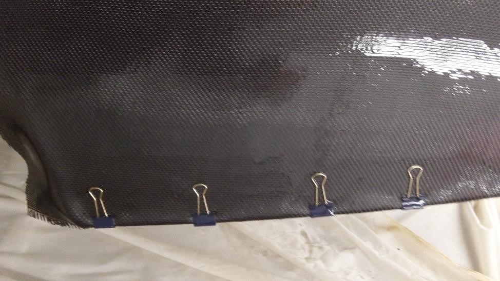 Мы взяли простую ленту Скотч и обклеили весь наш стеклотканный нижний колпак снаружи. Это очень интересная и веселая работа и надо сказать получилась она неплохо. Я отрезал пару отрезов Карбона , раскроил под покрытие всего колпака и стал клеить А пока клеил заделал концевички простыми канцелярскими прищепками чтобы костюмчик аккуратненько сидел