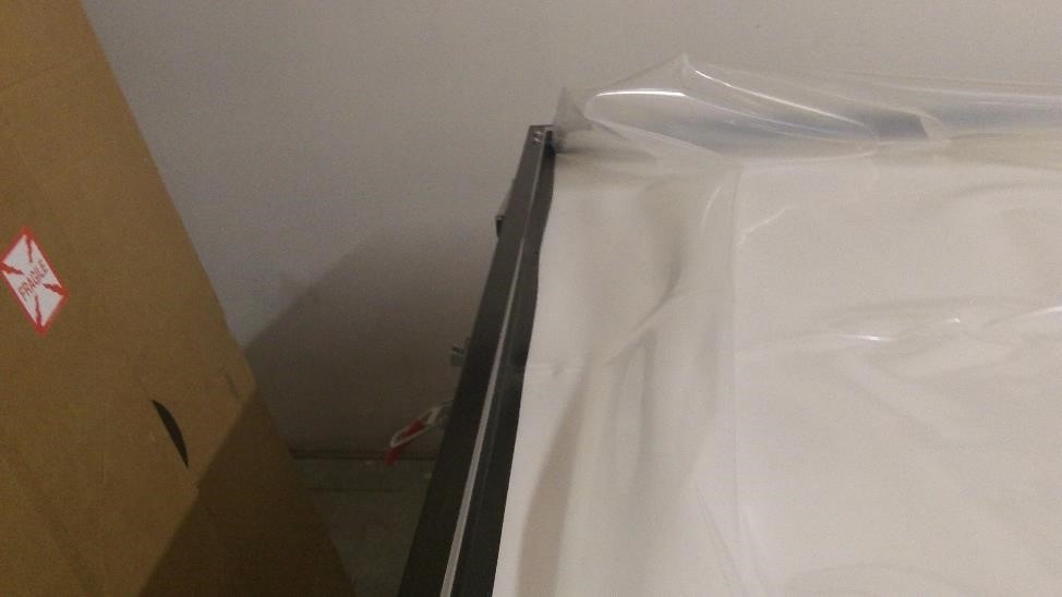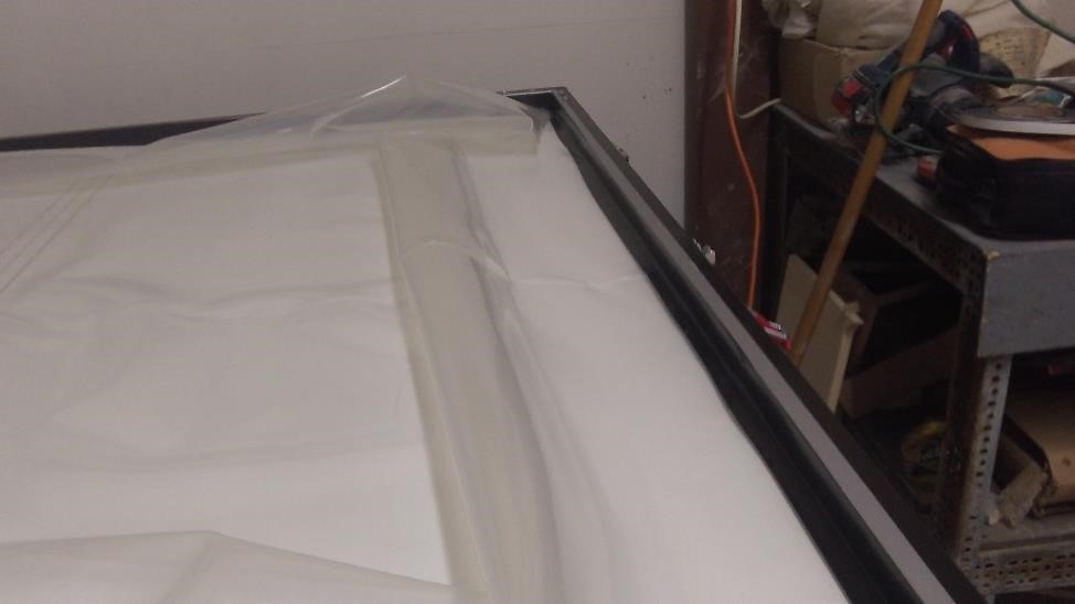 Когда она опущена между нею и плоскостью стола должен быть зазор заполненный уплотнителем Вы его видите по контуру стола первая партия уже приклеена. Потом вплотную к ней приклеивается изнутру вторая линейка уплотнителя которая должна будет еще и силиконовой пленочкой покрыта. Пока я ее еще не делал и не герметизировал столешницу. Но зато мешок проклеи по контуру гориллой скотчем так чтобы рамка удерживала мешок "в стоячем" положении и не давала ему "приклеиваться" к столешнице.