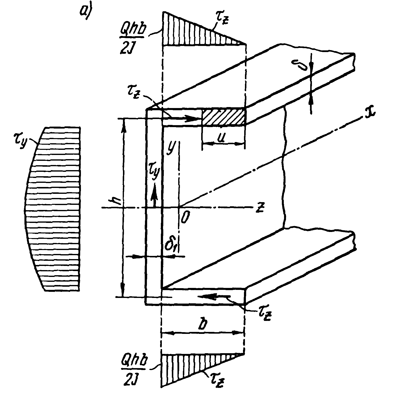 Так распределяются касательные напряжения в вертикальной плоскости полки. В этой плоскости разница напряжений в полке не велика.