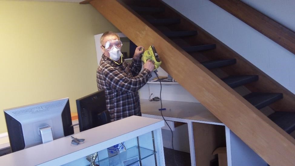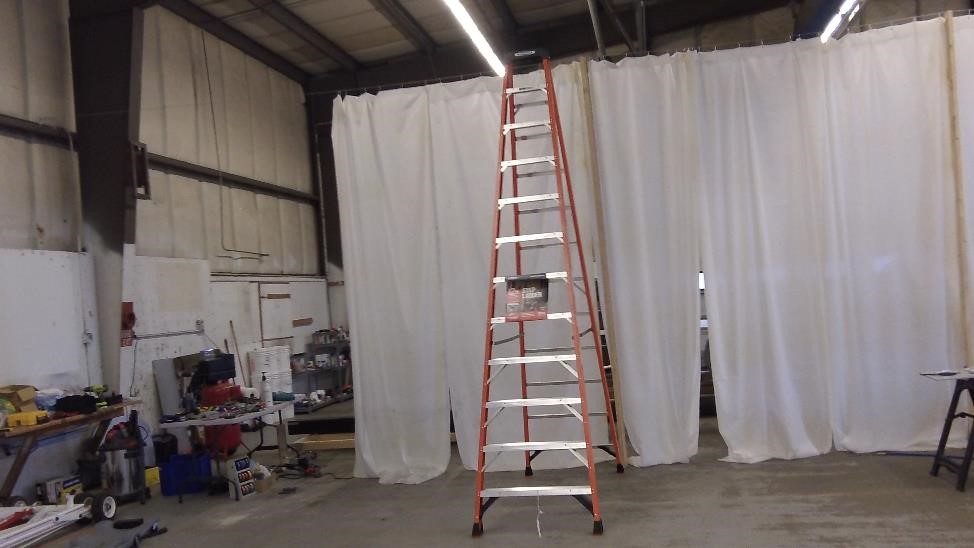 Теперь надо не забыть рассказать об окончании работы "вверху" по установке занавеса с которого начинается сцена. Пока у менй ане было лестницы весшал я эти ласкутки в общем то по алпинистки: залазел на стол, вскарабкивался по стене , достигал переправы , страховался и цеплял очередной пакет из стеклотканной полотна. Вчера же я прикупил наконец 12 фт лестничку. И с помощью вот этого вполне устойчивого элемнета способного меня удержать без особых проблем, я и развесил оставшиеся три полотнища.