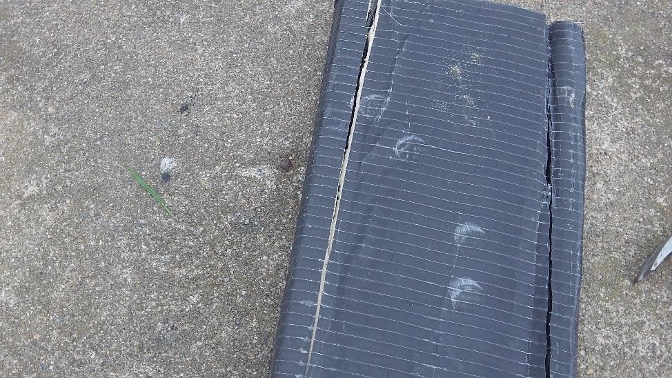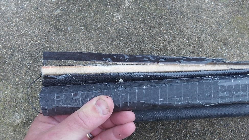 Теперь начинаю дубасить молотком со всей дури по разным сторонам лонжерона Итак смотрите результат Первая серия ударов прошлась по трубам.. Фигушки - никаких вмятин или трещин. Вторая серия ударов более менее пробила слой (один слой все го то карбона но пенопласт выдержал. Третья серия ударов надломила соединение (неполное) трубы с пенопластом - и разошелся однонаправленный карбон по своему продольному волокну