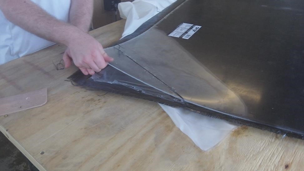Ну и конечно же надо показать как же все таки мы делаем наши "боевые" детали. Сейчас под вакуумом находится "глянцевая" панель - мы ее делаем первый раз поэтому пока показать нечего. Из того что сделали накануне посмотрите как выглядит "неглянцевая" панель и лонжерон (Дядь Серёжа : Внимание - репортаж не для слабонервных!! постарайтесь сначала глубоко взфдохнуть пару раз чтобы наполнить Ваши натруженные лёгкие веселящим кислородом)