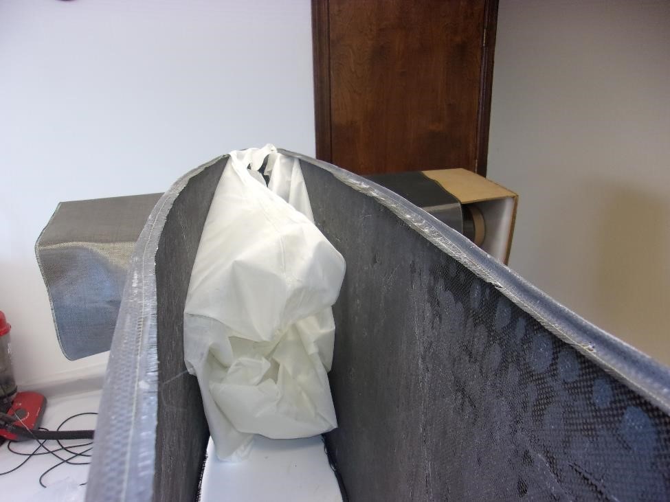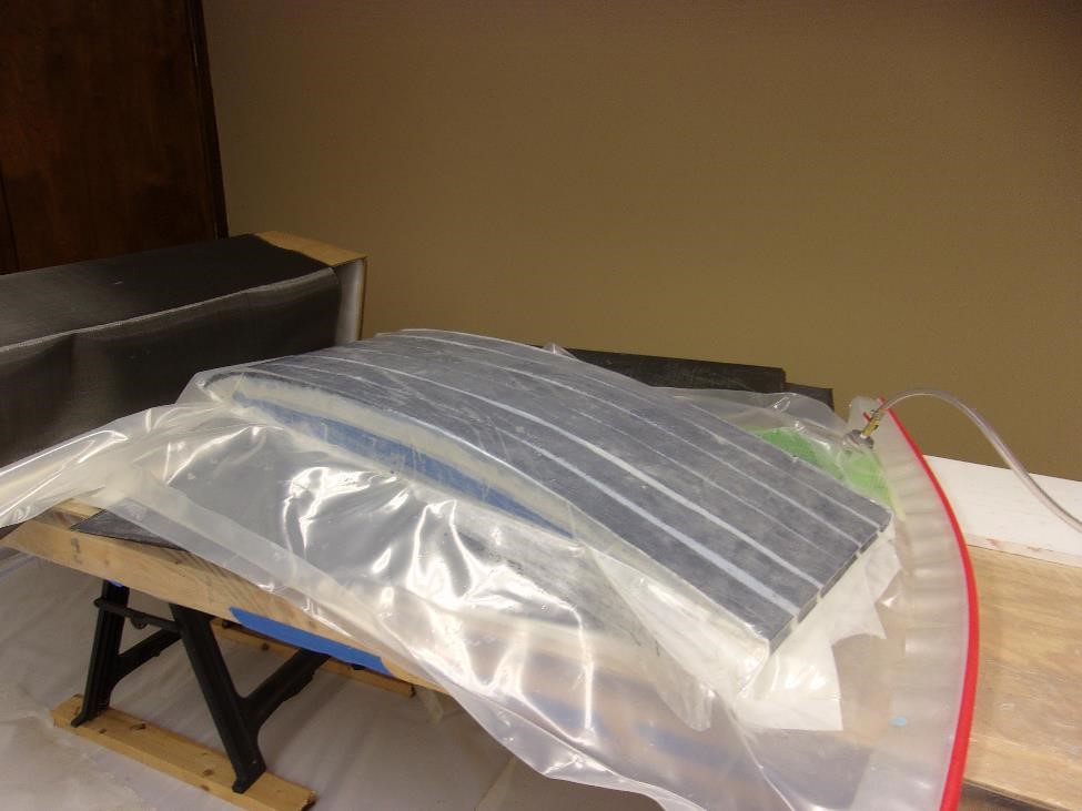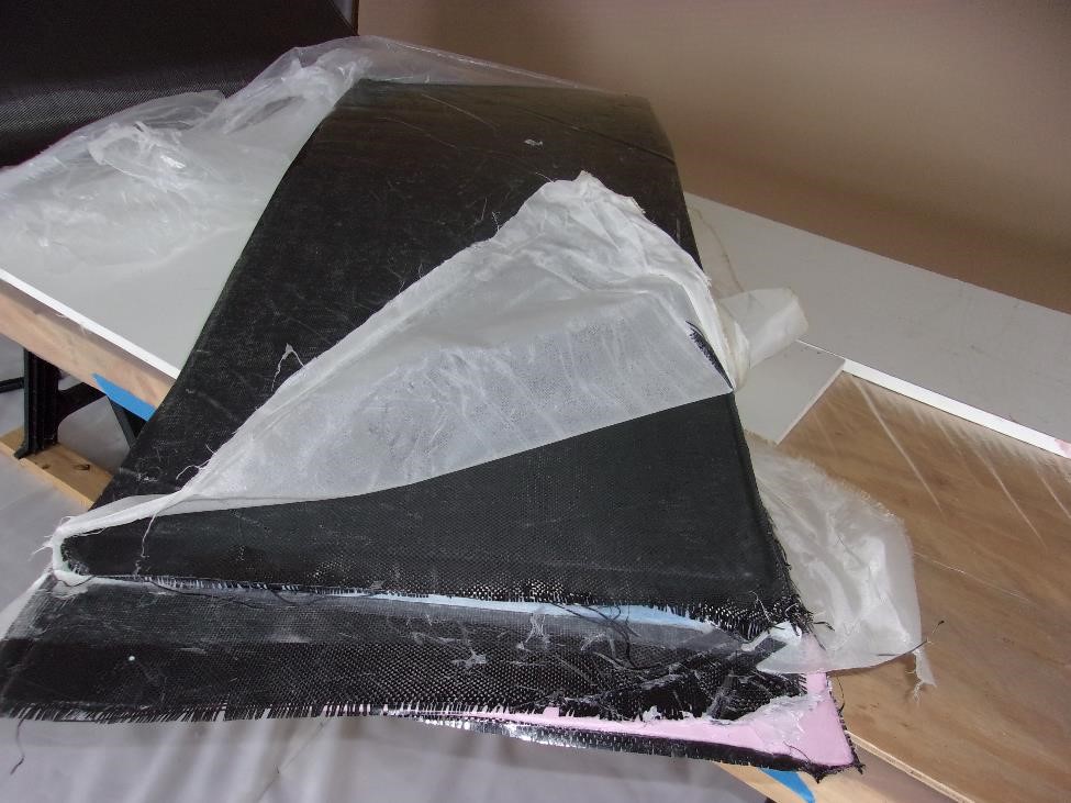 Итак давайте напомню что там у нас было в мешке. Для наших самых невнимательных товарисчей из Ольгино я повторю: там было пять слоев композита покрытого полиэтиленовой пленкой и засунутого в вакуумный мешок. Сама болванка (синего цвета) была промазана воском очень тщательно и не один раз , а если помните - она сделана из пенопласта, зашпаклевана БОНДО, Обклеена стекловолокном , поверх вдоль обклеена синей лентой 3M для покраски а поперек целлофановым прозрачным скотчем. Именно поверхность глянцевой стороны скотча и обмазывается несколько раз перед каждой закладкой ваксой это делается для того чтобы легче было снимать весь бутерброд с болванки. Итак поверх болванки пять слоев композита: