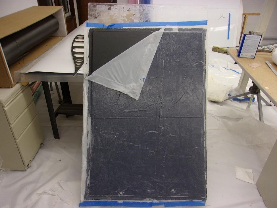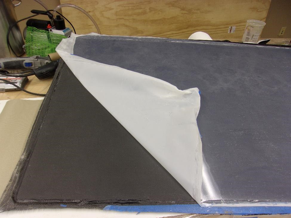 Прежде чем пойти помыть руки , голову, нос итд и лечь спать хочу поделиться проделамнной за сегодня работой. Для начала я снял с вакуумного стола две панельки которые заложил накануне. Покажу очень подробно процесс де-ламинизации. Итак если мои многоуважаемые интернетосмотрители помнят мы заложили в ствол вакуумного стола две панельки Каждая размером в 32" х 48 ". После того как разгребли снег и в ангар стало просто заезжать - я выключил насос на столе, подал воздух под крышку , снял обе панельки с поверхности стола и внес в теплую лабораторию. Покажу отдирание первой. Итак сначала снял верхний слой полиэтилена. Роль полиэтилена в этом случае играла использованная прошлый раз отдирашка. Она на себя тоже приняла часть смолы и ее опять пришлось отдирать. Потом был слой "живой" отдирашки. И вы видите как различается "пользованная" от нецелованной ни разу. Когда добрался до карбона , поддел всю панель за нижний слой отдирашки и разделил ее от Плексигласа. Нижний слой отдирашки врезультате такой операции стал глянцевым. А вот под ним получился просто замечательный гладенький ровненький сандвич. Такая панель "на базаре" стОит в розницу под $1000 . Мне она нужна как я уже говорил для изготовления различных шпангоутов и рёбер - что пока самая насущная задача.