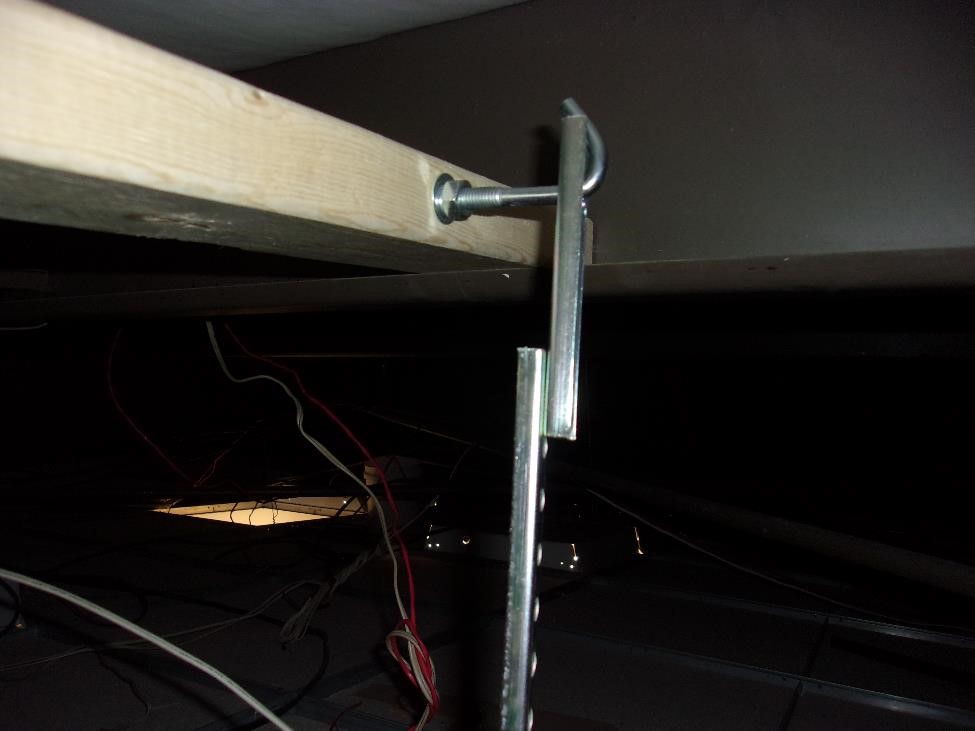 Следующим номером нашей программы - это разместить все эти красотулички на втором этаже по мере размещения подвесного потолка. как это я делал. Сначала разметил балочки 2х4 по длине между швеллерами фермы Ангара . Присверлил их к фланцам. Навесил крючки а на них держалку. К этим держалкам и прикрутил сами потолочные юниты Итак давайте посмотрим по шагово. Сначала отпилил два бруска по длине между элементами фермы