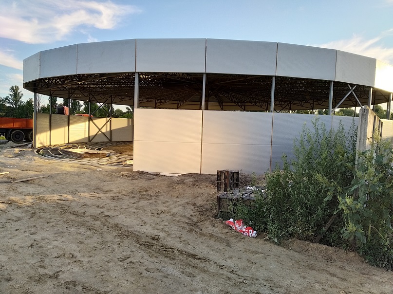 Продолжаем установку сендвичпанелей на стены круглого ангара и заканчиваем паять ПВХ мембрану на крышу покрасочного цеха.